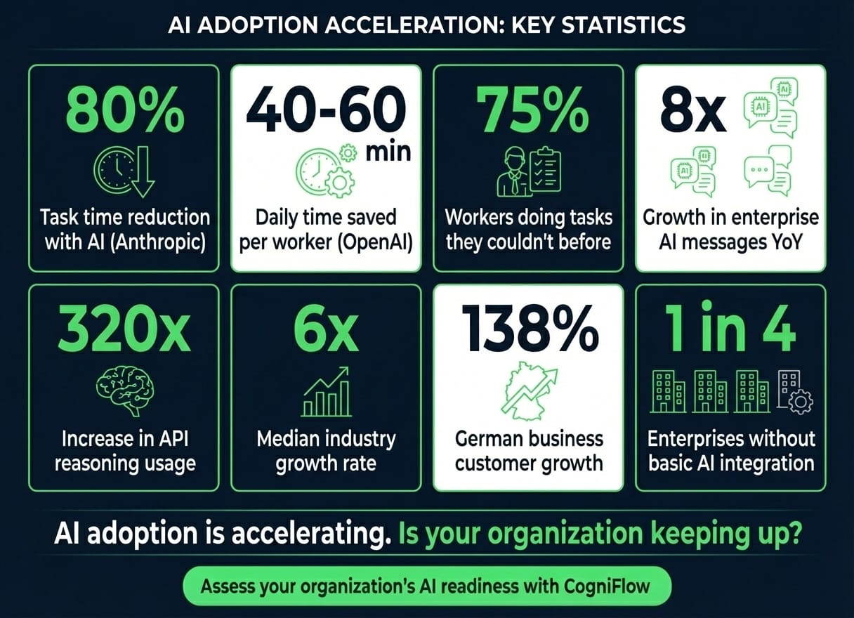 When I started building CogniFlow, the question was "Will AI impact my industry?" Today, the question has shifted to "How far behind am I?" And the research that dropped this year makes the answer uncomfortably clear.